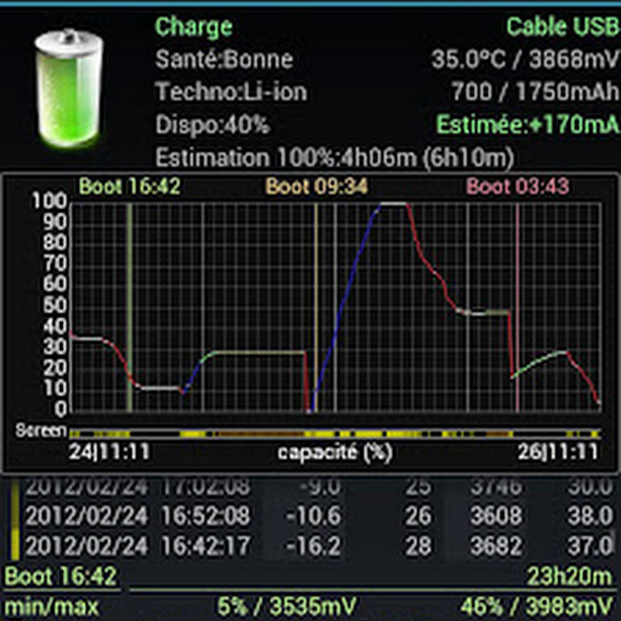 The most complete tool to manage your battery: Shows historical data (%, mA, mW, mV and temperature), calculates estimated run-times and battery aging, helps calibrate battery and improve your battery run-time.
